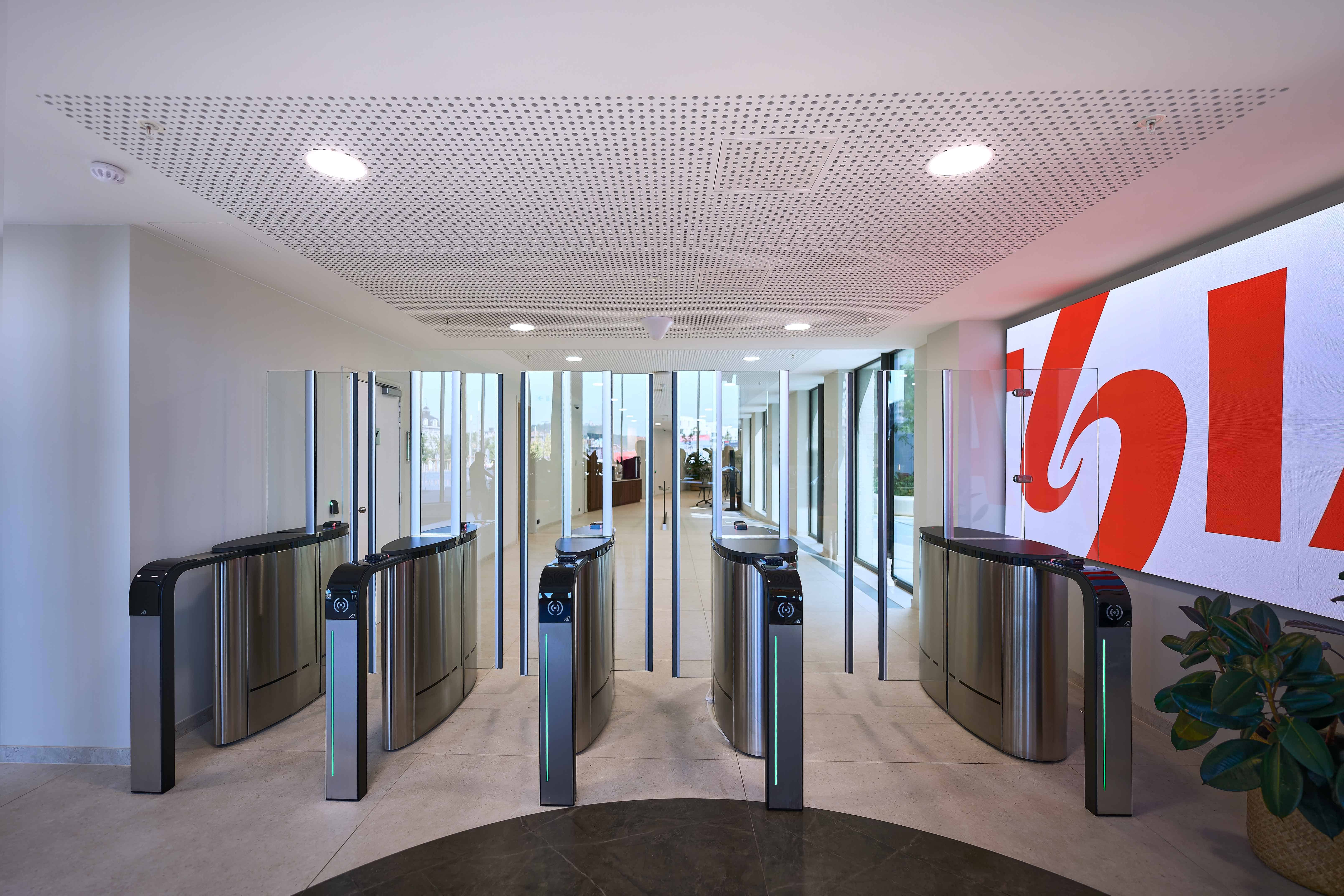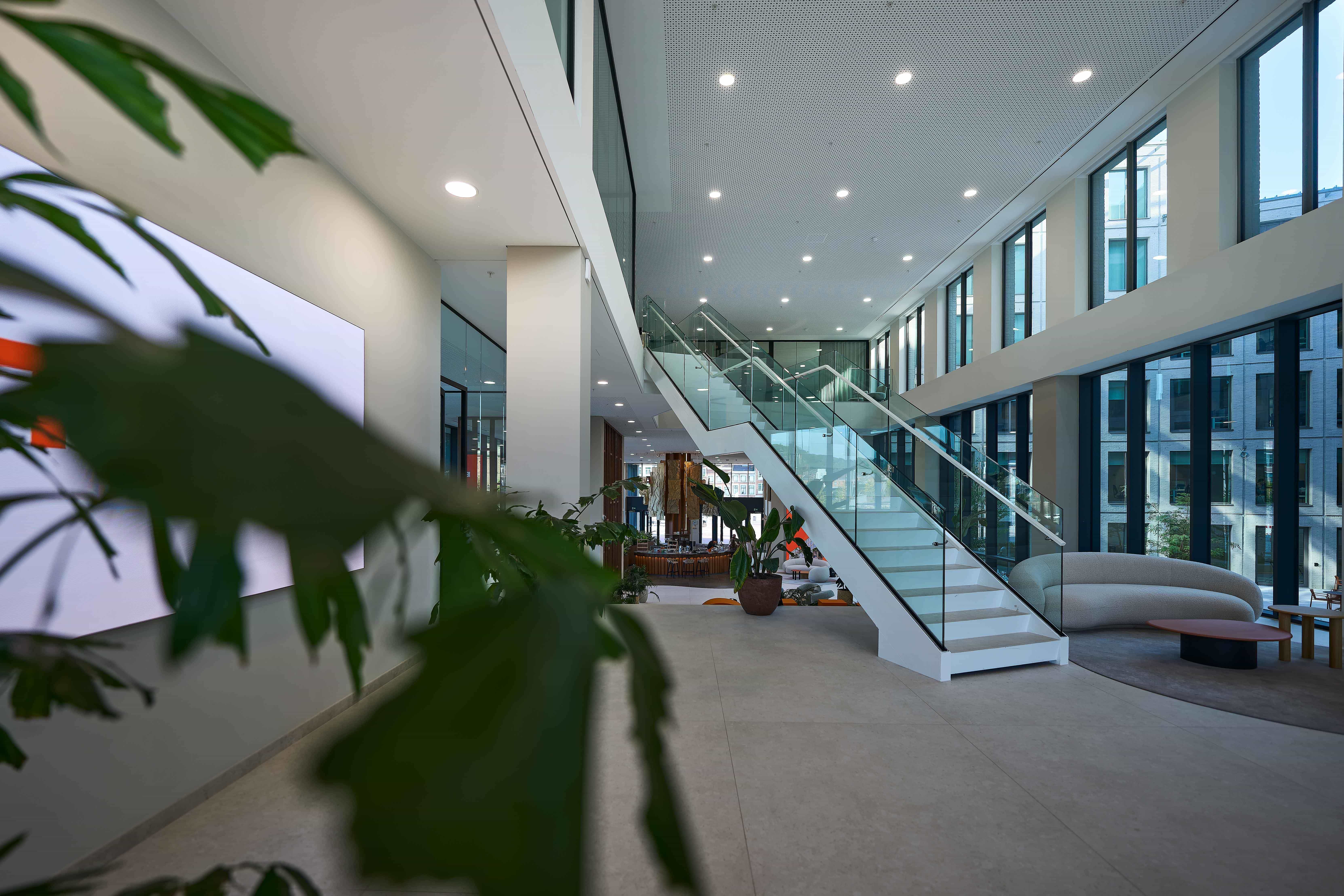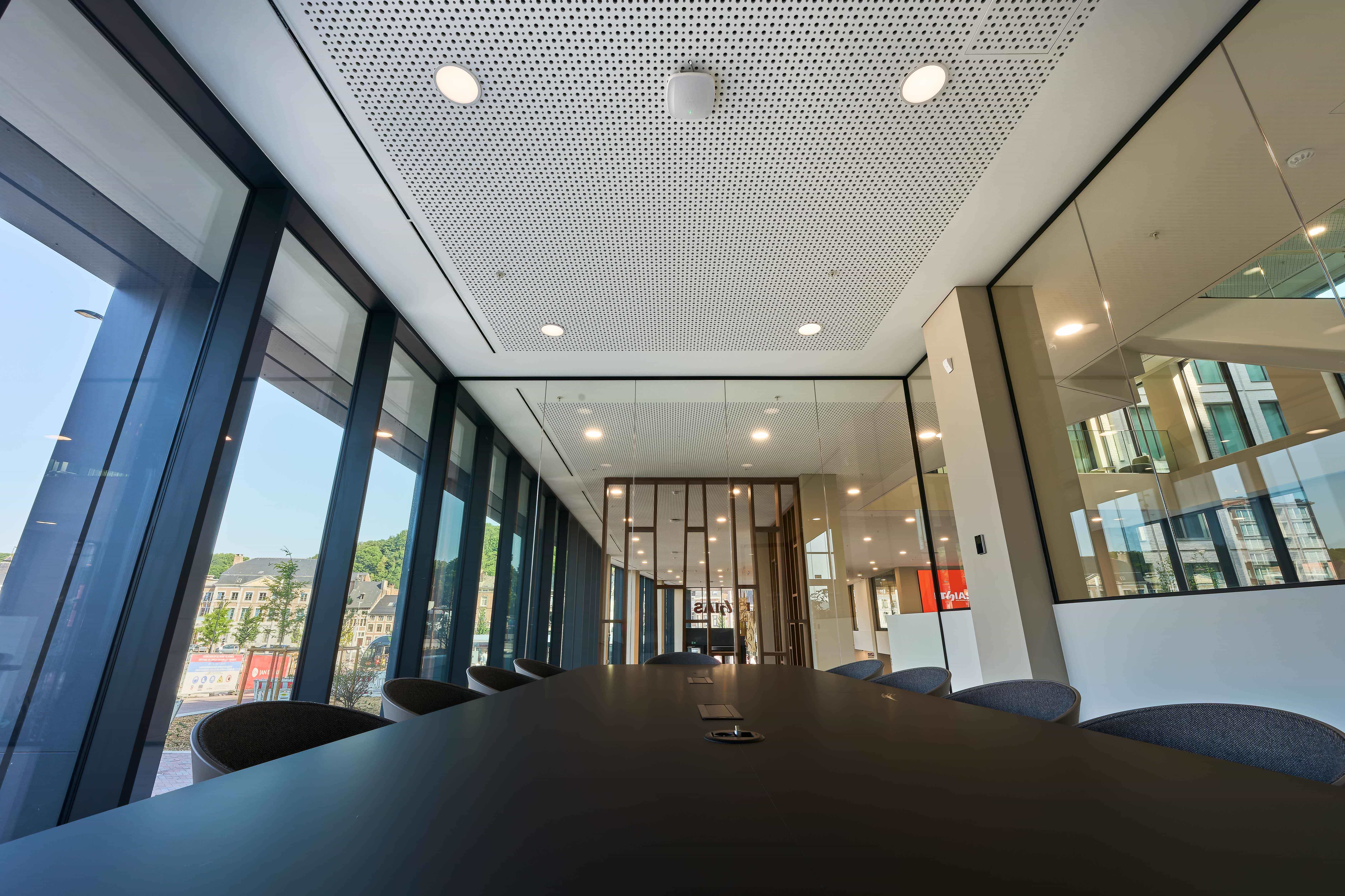 Voor de Ethias-toren werd gekozen voor de Alternato Cleaneo SoundDesign-platen (12 en 20 mm). Deze geperforeerde gipsplaten zorgen voor een optimale geluidsabsorptie en verkorten de nagalmtijd aanzienlijk in drukbezochte ruimtes zoals de inkomhal.