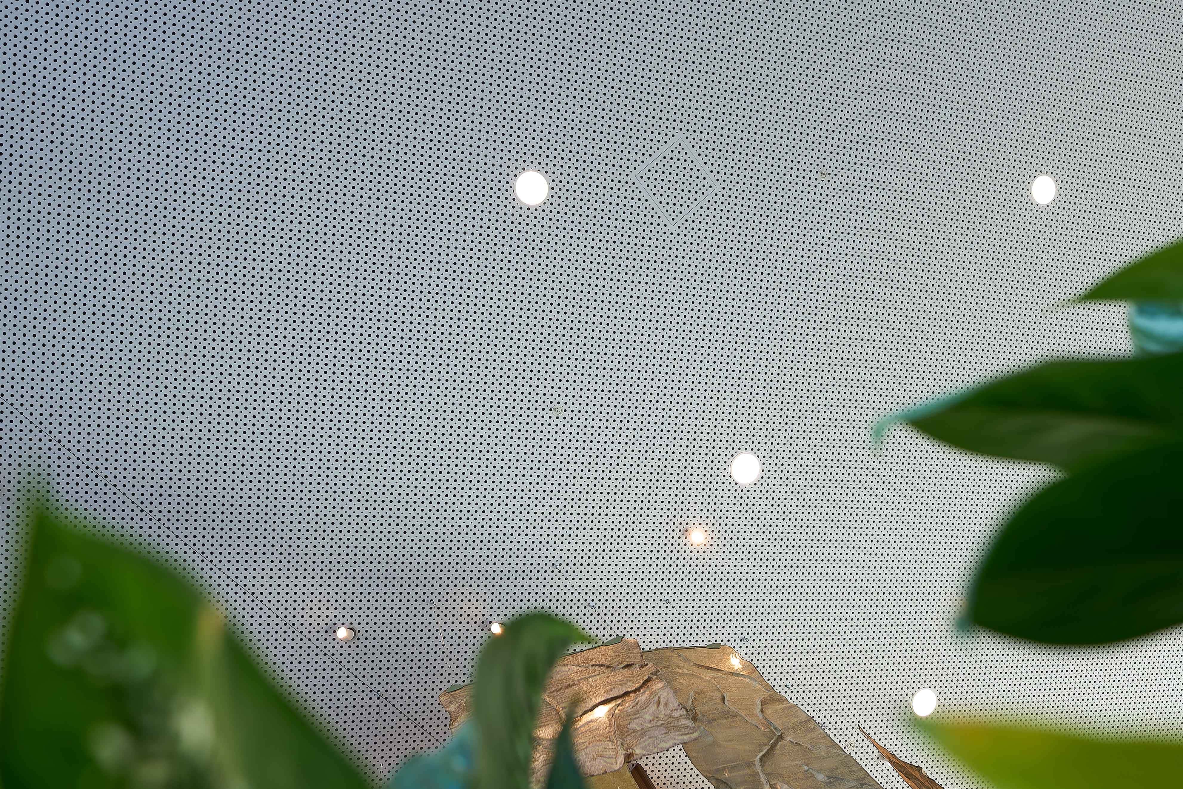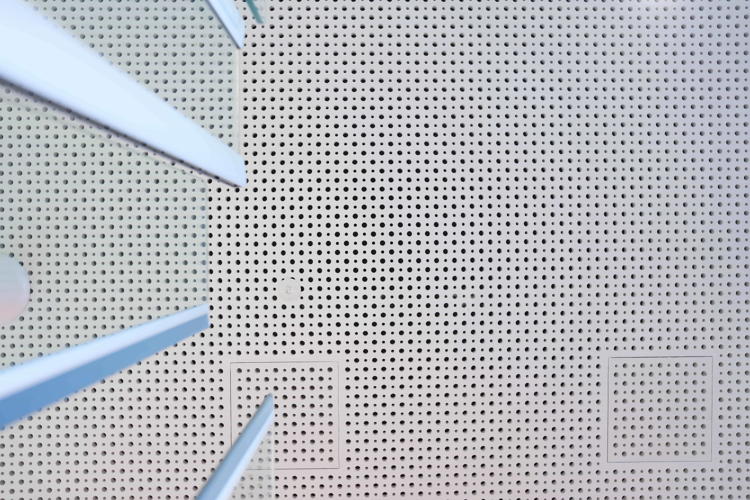 De platen zijn geperforeerd of gesleufd, waardoor ze een open structuur hebben die geluidsgolven absorbeert (voor de akoestiek), maar ook luchtstroming en contact met de plaat mogelijk maakt. De achterkant van de plaat heeft een vlies.